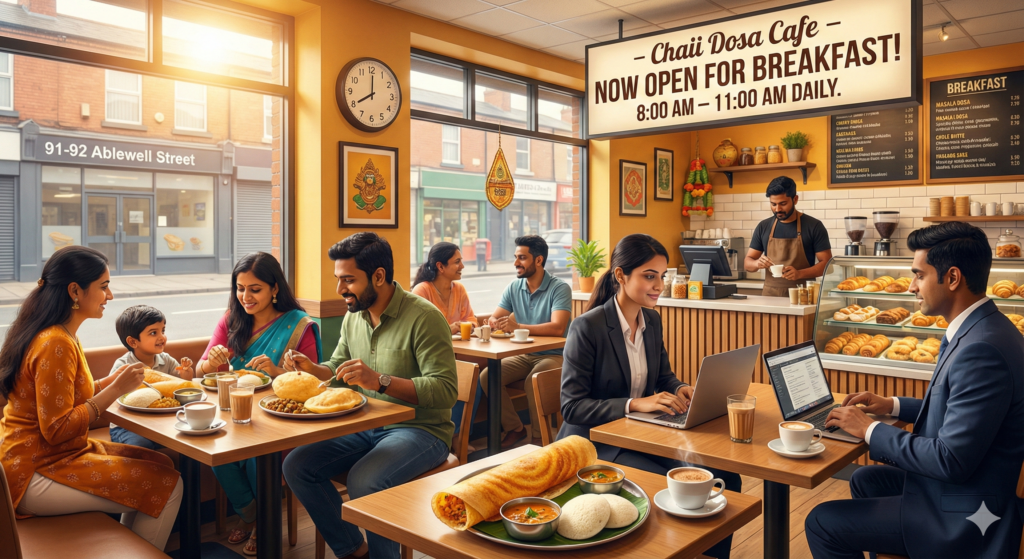 Chaii Dosa Cafe, the popular vegetarian Indian restaurant at 91-92 Ablewell Street, Walsall, has announced exciting new breakfast hours to meet growing demand from the local community. Starting this week, we’re opening our doors at 8am daily, serving our authentic South Indian breakfast menu until 11am.